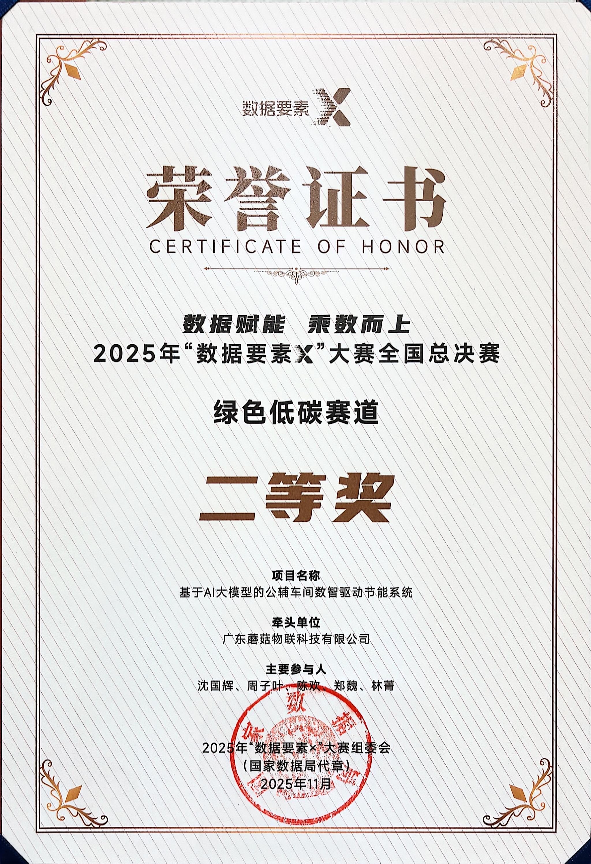 数字经济时代,数据这一新型生产要素,被人形象地称为“新的石油”。不久前,2025年“数据要素×”大赛全国总决赛上,来自广州南沙的广东蘑菇物联科技有限公司(下称“蘑菇物联”)凭借在工业数据与绿色低碳领域的创新实践,从近千个参赛项目中脱颖而出,斩获绿色低碳组全国二等奖,也是组内唯一获奖的民营科技企业。